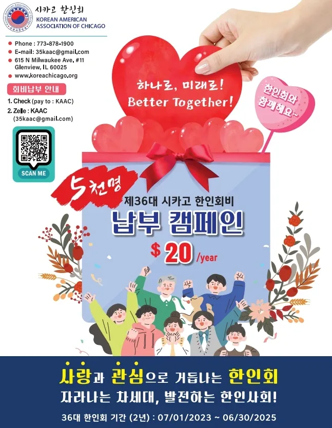 The 36th KAAC has officially launched a campaign for annual membership fee payment. This campaign aims to secure 5,000 members who will pay the annual membership fee of $20, with the goal of strengthening the long-term role of the KAAC and promoting the growth of the next generation and the advancement of the Korean community through the stability of the KAAC’s operations.